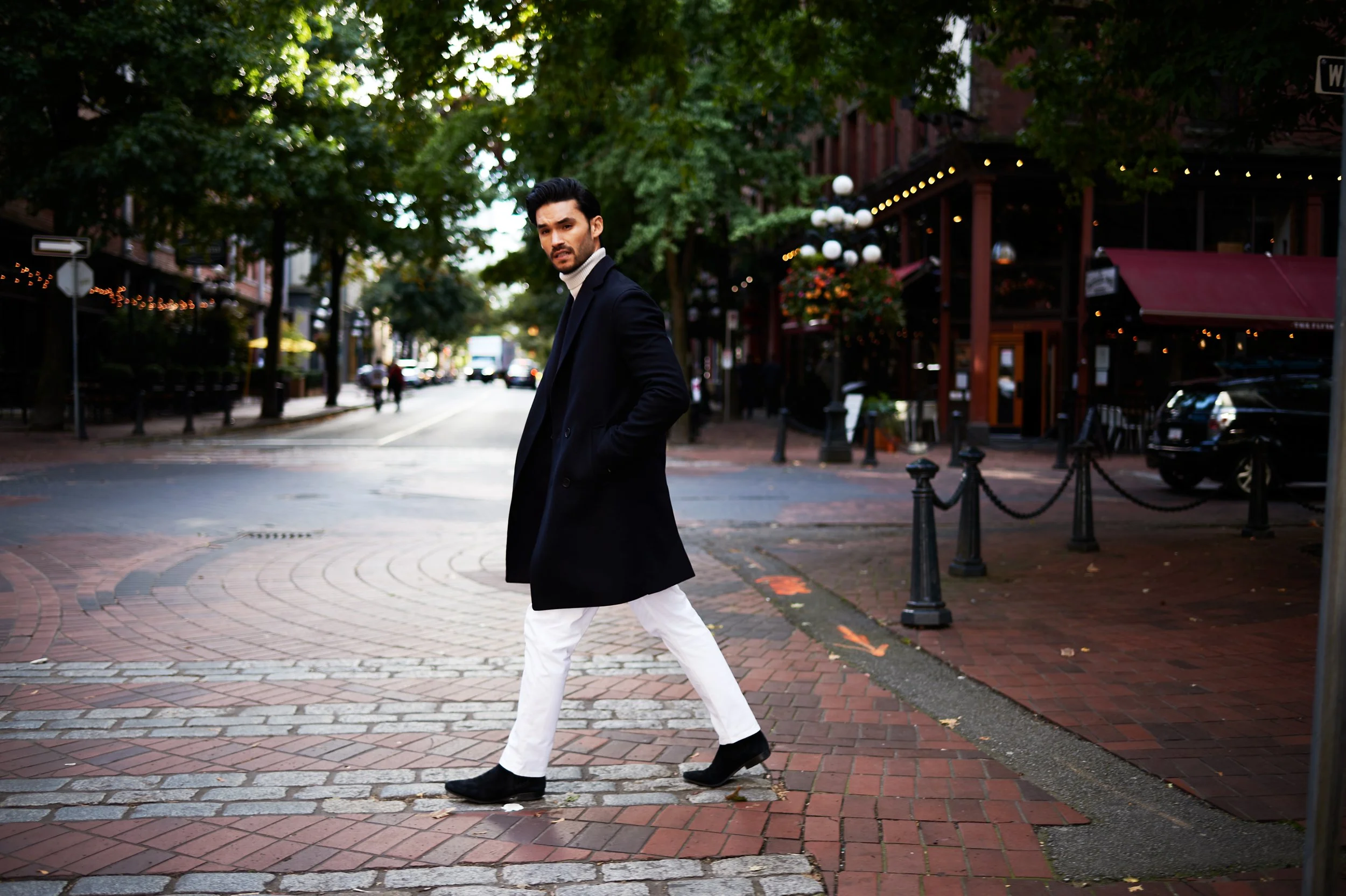 A man dressed in a black coat, white pants, and black shoes crossing a city street in the evening, with trees and buildings in the background.